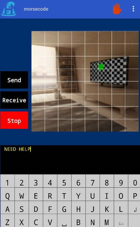 To receive morse code, hold your cell phone steady and pan over to the flashing blacklight. Your output will appear in the same area as the "NEED HELP". In order for receive to work properly the camera must be held steady.